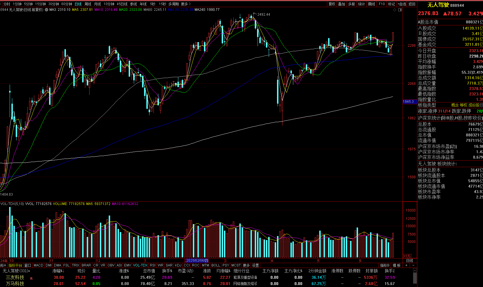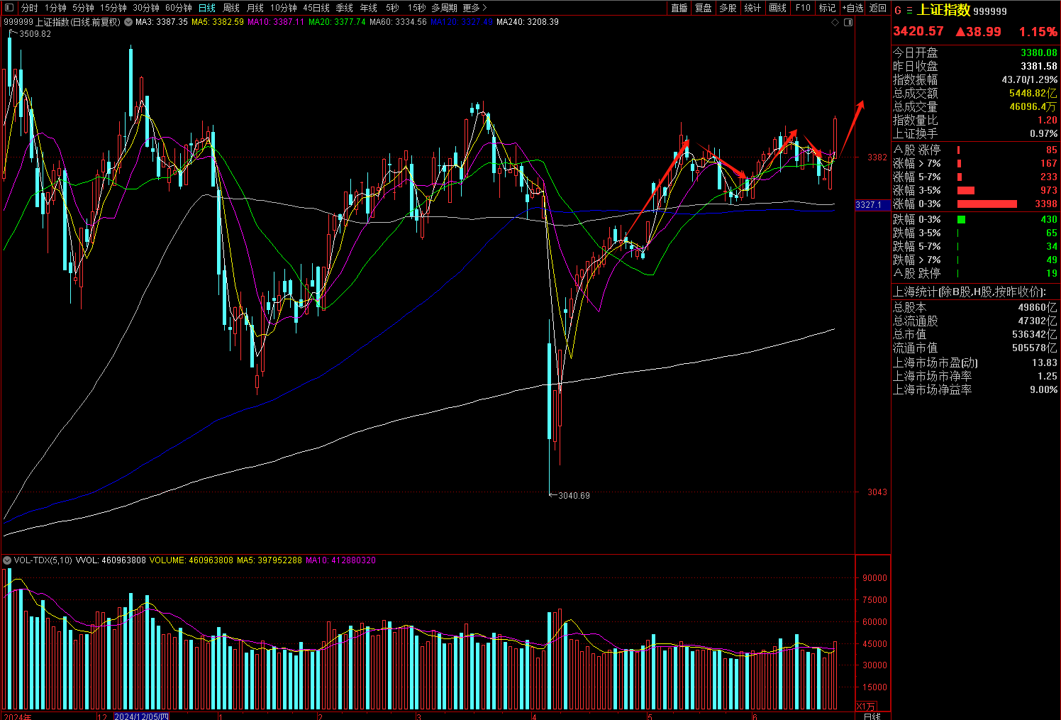 三大指数震荡上行且成交量显著放大,其中上证指数上涨1.15%,深证成指上涨1.68%,创业板指上涨2.30%。整体来看,多数个股呈现上涨态势,上涨个股数量达 4771家,非ST个股涨停数量为71家,非 ST个股跌停数量为18家,市场情绪持续保持高涨。沪深两市合计成交金额1.41万亿元,较前一交易日增加2920亿元,成交量实现大幅增长