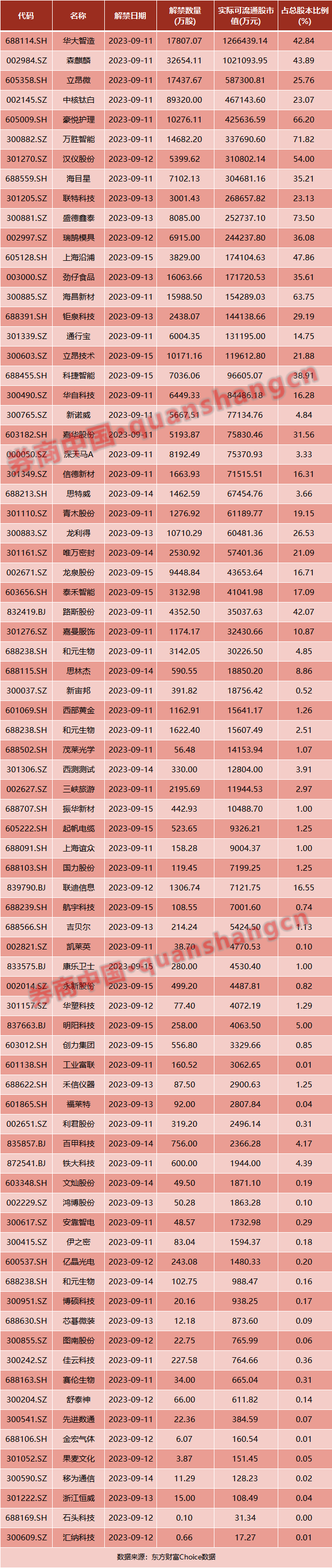 10、本周超750亿市值限售股解禁,华大智造解禁市值达126.6亿