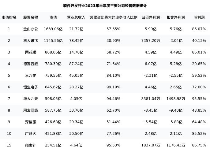 指南针最新报告期数据为半年度,下表汇总了软件开发行业内市值靠前的公司半年度主要经营数据