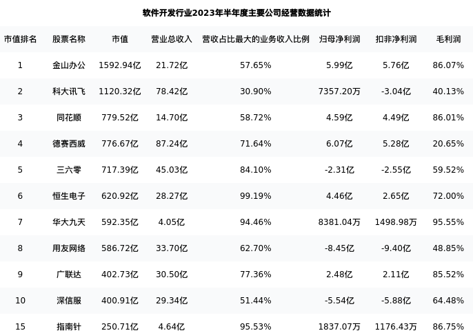指南针最新报告期数据为半年度,下表汇总了软件开发行业内市值靠前的公司半年度主要经营数据