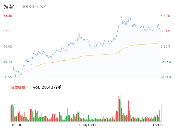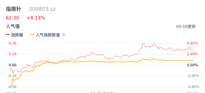 09月08日,指南针收报62.30,股价涨幅4.13%,成交金额17.41亿元,换手率7.04%。