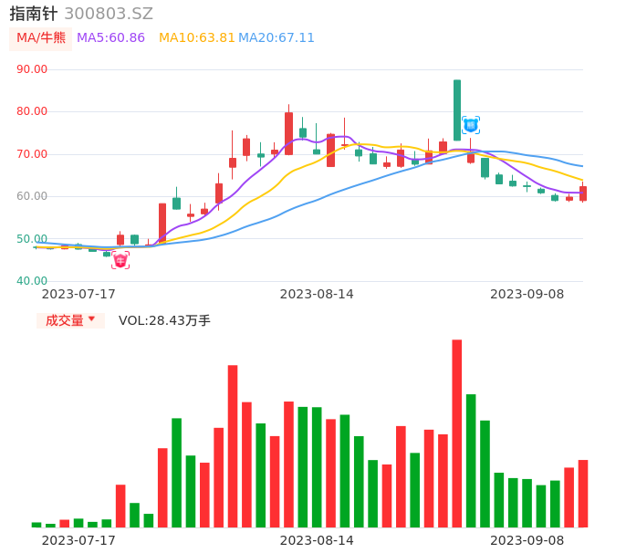 09月08日,指南针收报62.30,股价涨幅4.13%,成交金额17.41亿元,换手率7.04%。
