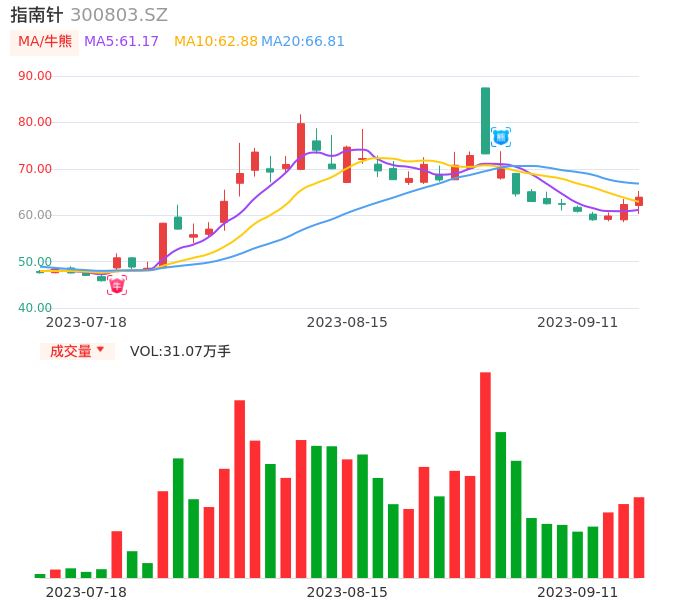指南针在8月29日出现日线级别熊点,虽然60分钟处于牛点区间,短期有所弱势反弹,但股价目前整体处于中期下降通道,建议在日线级别未转为牛点信号前继续谨慎观望。