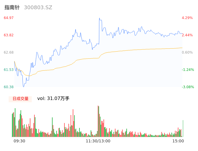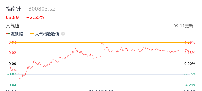09月11日,指南针收报63.89,股价涨幅2.55%,成交金额19.57亿元,换手率7.69%。