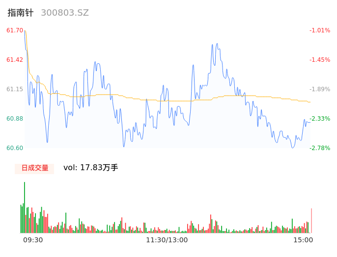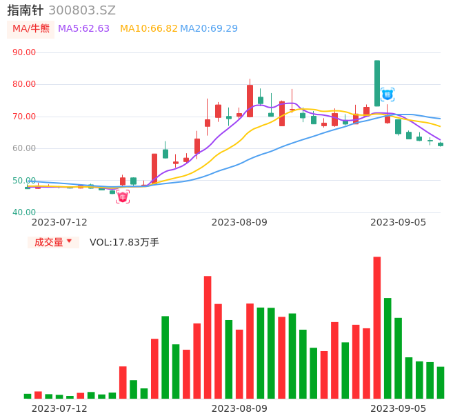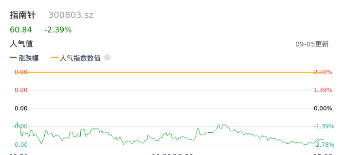 09月05日,指南针收报60.84,股价涨幅-2.39%,成交金额10.88亿元,换手率4.42%。