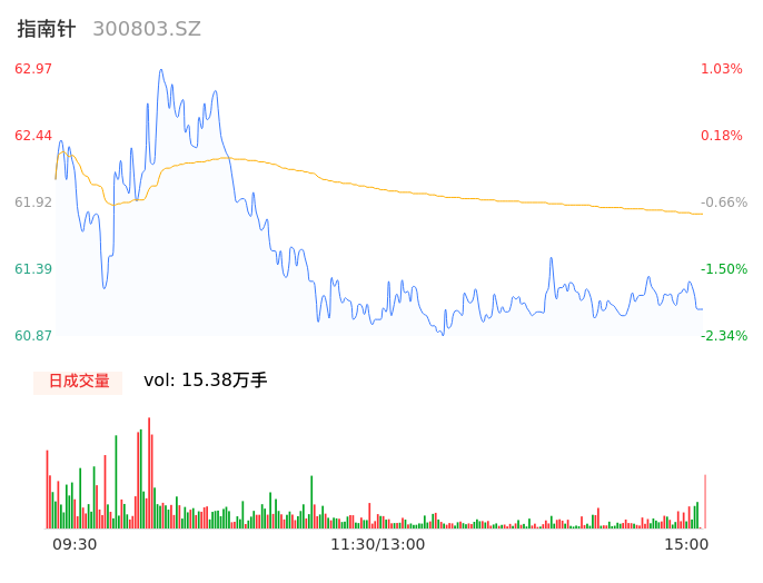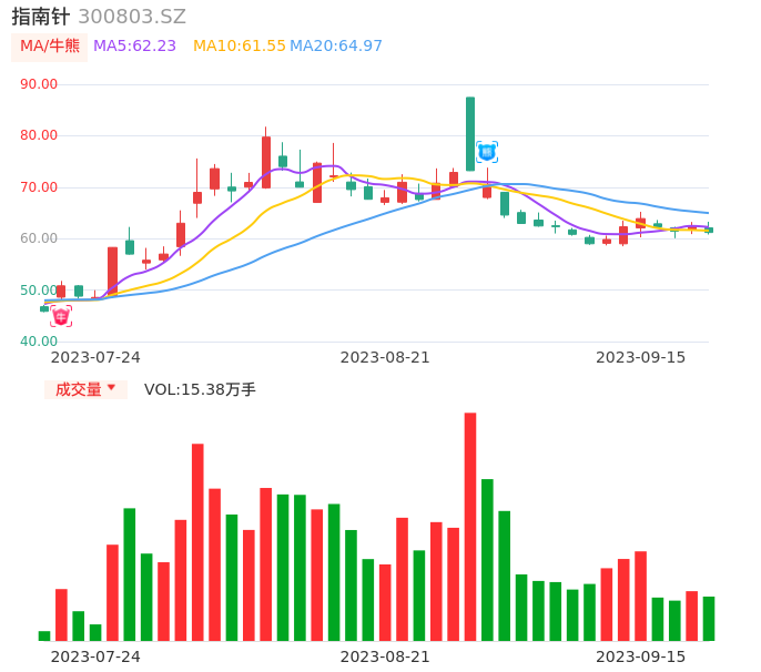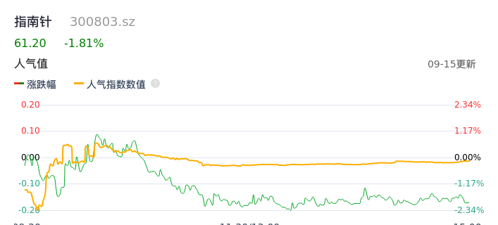 09月15日,指南针收报61.20,股价涨幅-1.81%,成交金额9.51亿元,换手率3.81%。