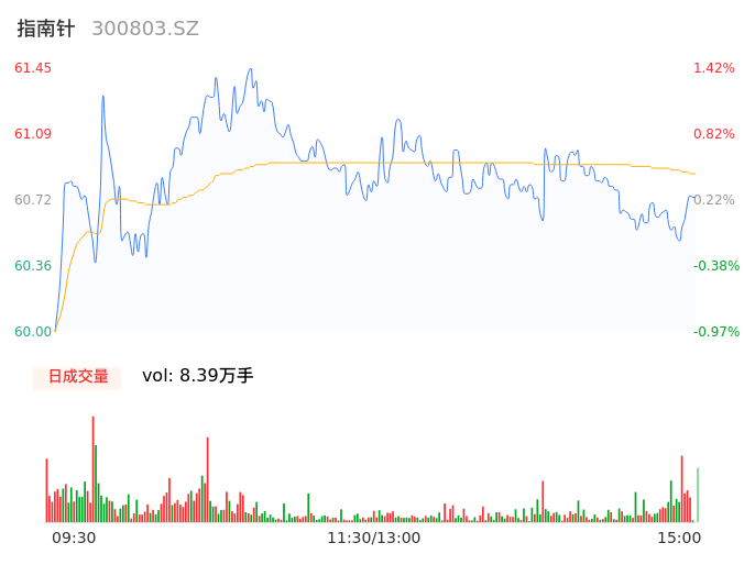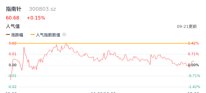 09月21日,指南针收报60.68,股价涨幅0.15%,成交金额5.11亿元,换手率2.08%。