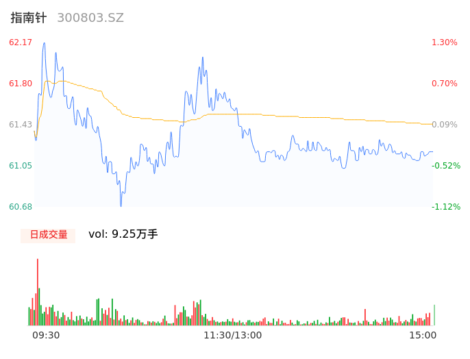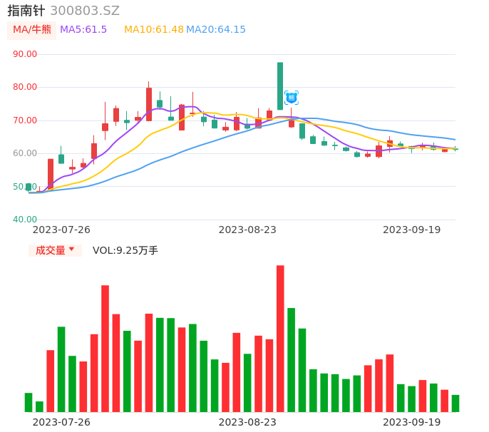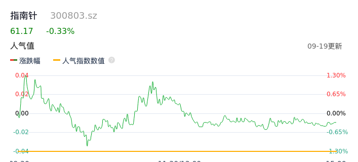 09月19日,指南针收报61.17,股价涨幅-0.33%,成交金额5.68亿元,换手率2.29%。