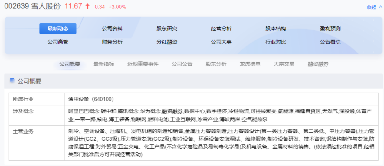 今天为大家带来的是雪人股份,我们先来了解一下这家公司是做什么的,我们通过公司概要可以清楚的看到:公司所属行业是通用设备