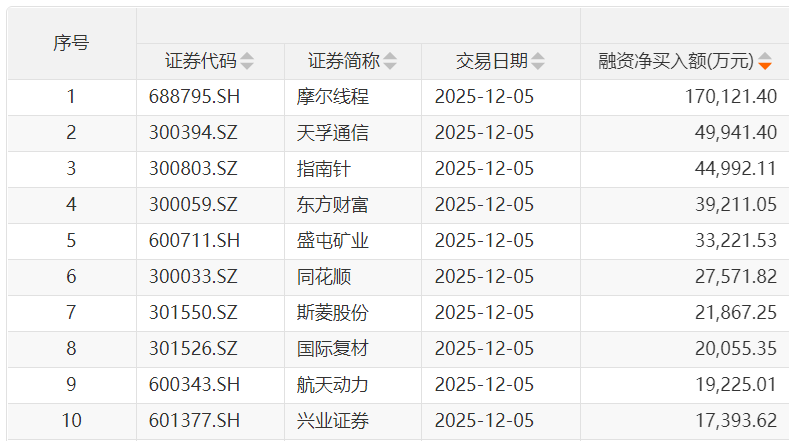 个股方面,25股获融资净买入额超1亿元。摩尔线程获融资净买入额居首,净买入17.01亿元;融资净买入金额居前的还有天孚通信、指南针、东方财富、盛屯矿业、同花顺、斯菱股份、国际复材、航天动力、兴业证券等。