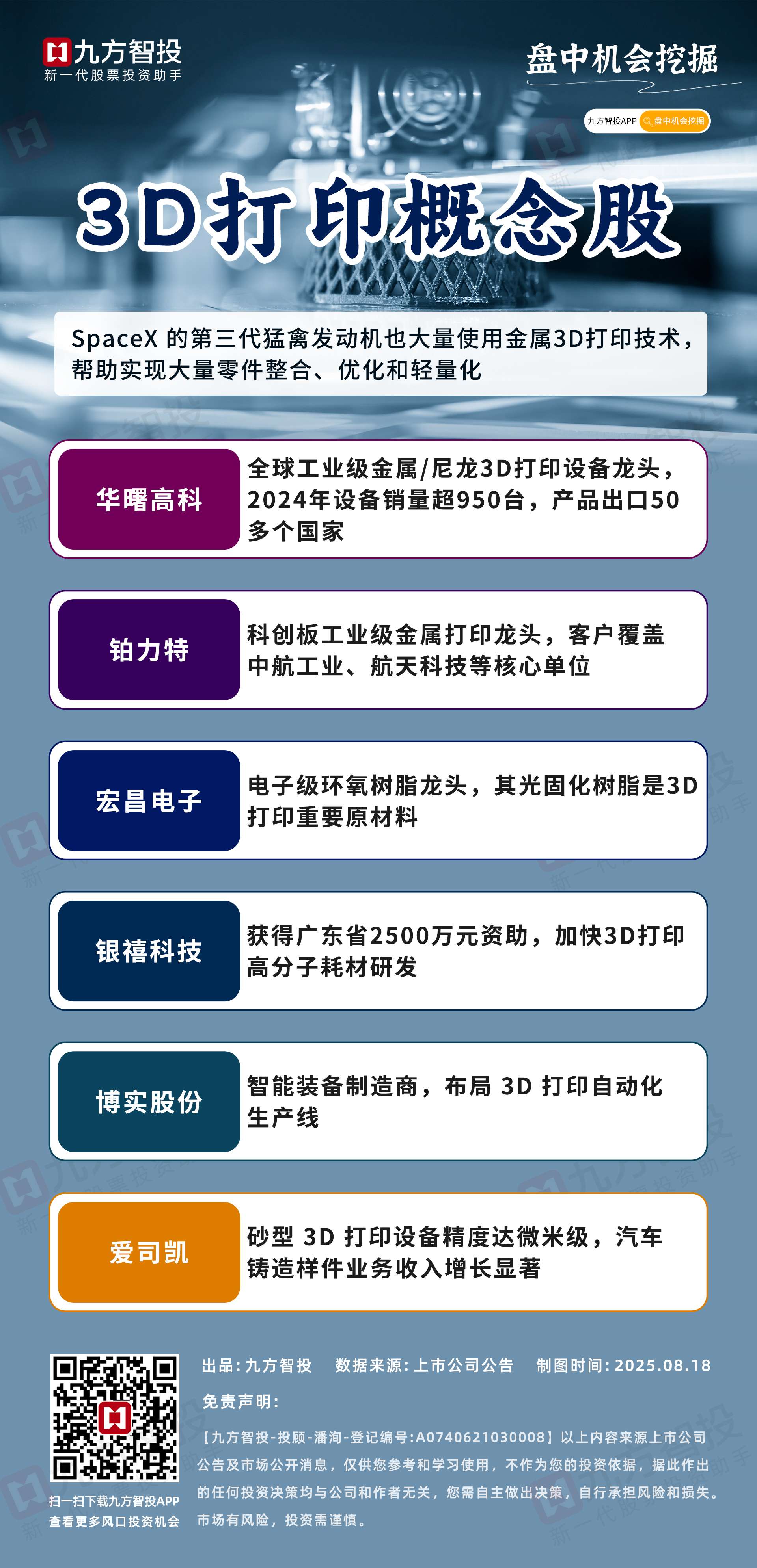 今日题材挖掘:SpaceX的第三代猛禽发动机也大量使用金属3D打印技术,帮助实现大量零件整合、优化和轻量化(3D打印概念股);