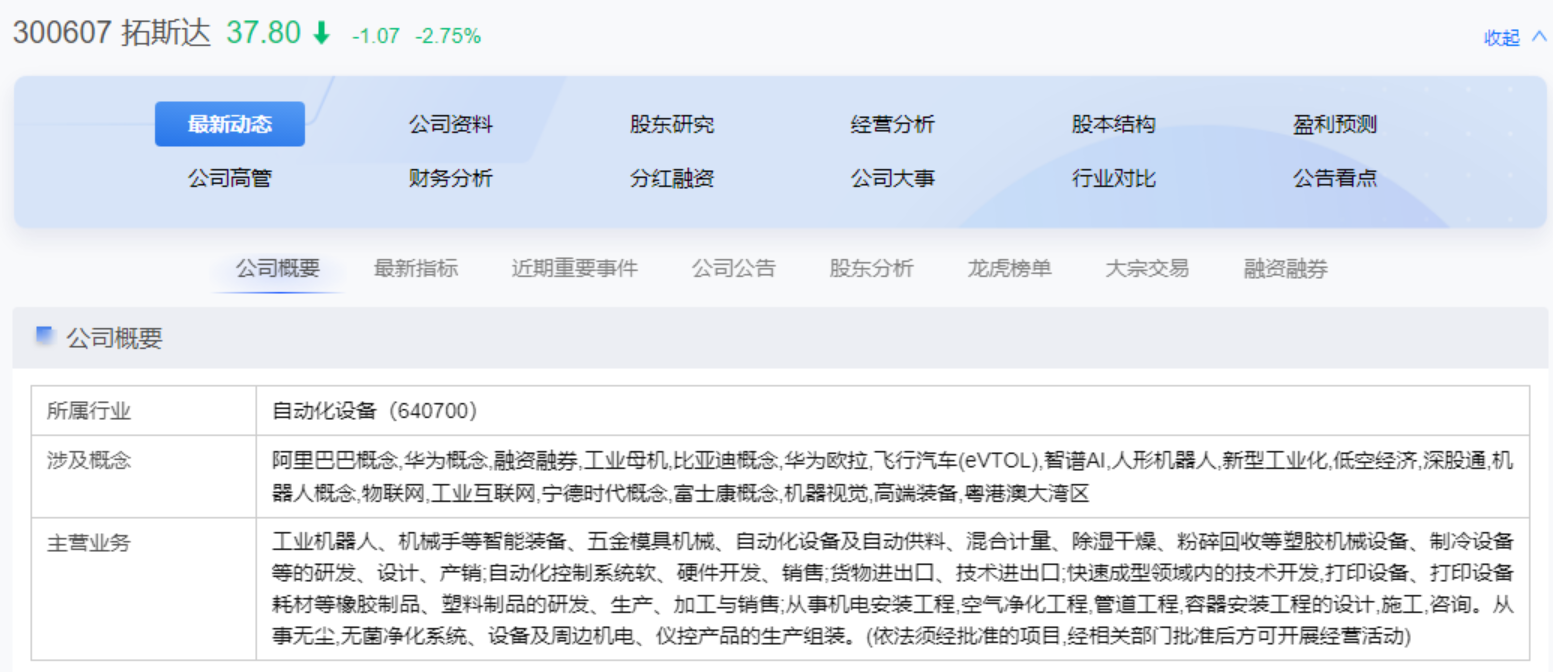 今天为大家带来的是拓斯达,我们先来了解一下这家公司是做什么的,我们通过公司概要可以清楚的看到:公司所属行业是自动化设备