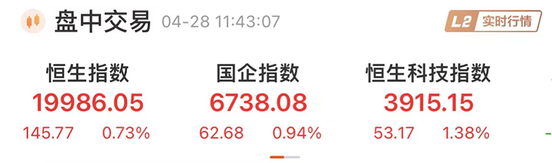 4月28日,港股三大指数高开高走,前期回调的AI概念股再度集体走强,截至发稿,美图公司涨逾6%,商汤-W涨近3%,创新奇智涨超5%。科技股大放异彩,比亚迪电子涨超5%,网易-S涨超4%,腾讯控股涨近2%,阿里巴巴-SW涨超1%。光伏电站、保险、家电、游戏股集体爆发。
