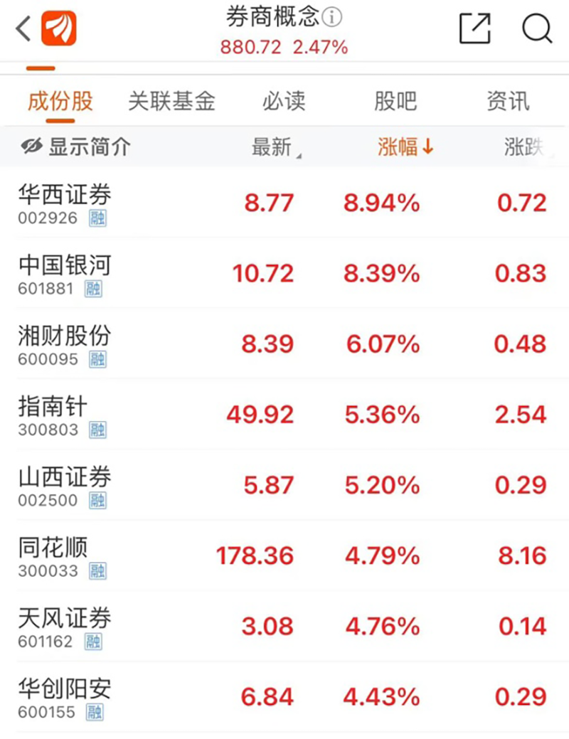 4月28日早盘,证券板块盘中大幅拉升。截至发稿,华西证券、中国银河涨超8%,湘财股份、指南针等涨超5%。