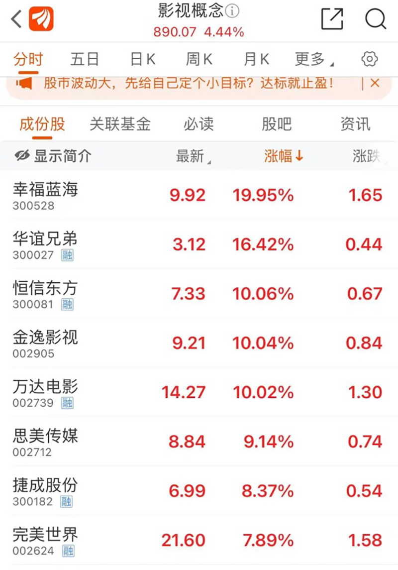 早盘,影视股掀起涨停潮,幸福蓝海、万达电影等多股涨停,华谊兄弟、横店影视纷纷大涨。