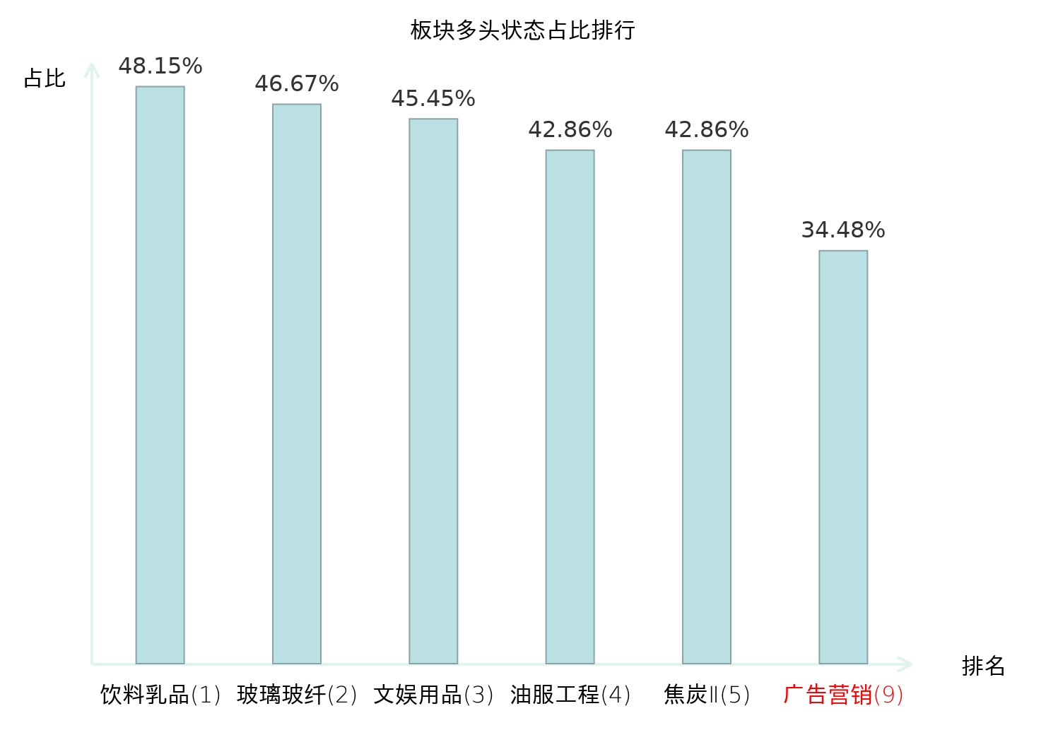 全市场所有行业板块中主力多头状态占比排名中,饮料乳品板块位居第一。商用车板块名次提升最快,较昨日上升77位。