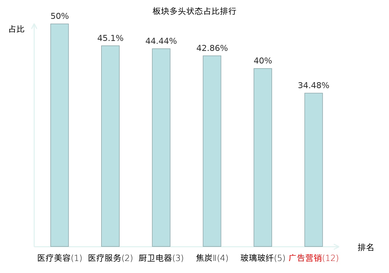 全市场所有行业板块中主力多头状态占比排名中,医疗美容板块位居第一。养殖业板块名次提升最快,较昨日上升90位。