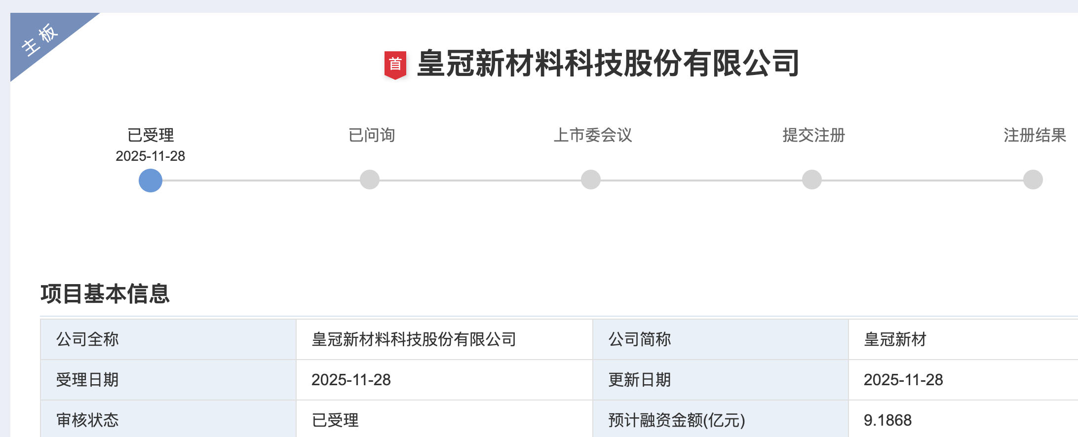 11月28日,皇冠新材料科技股份有限公司(简称“皇冠新材”)深主板IPO获受理,公司拟募资9.19亿元。