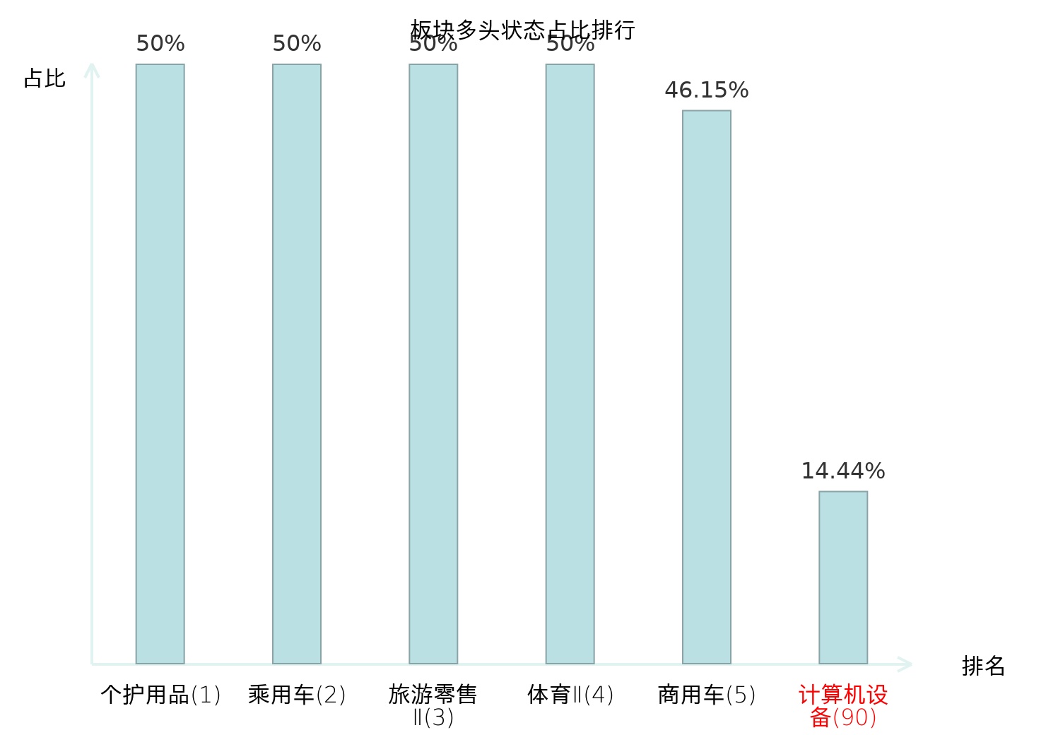 全市场所有行业板块中主力多头状态占比排名中,个护用品板块位居第一。林业Ⅱ板块名次提升最快,较昨日上升94位。