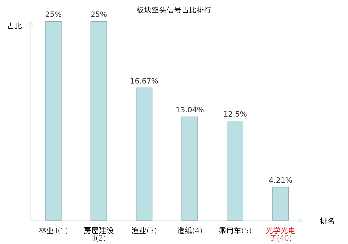 全市场所有行业板块中主力空头信号占比排名中,林业Ⅱ板块位居第一。通信设备板块名次提升最快,较昨日上升115位。