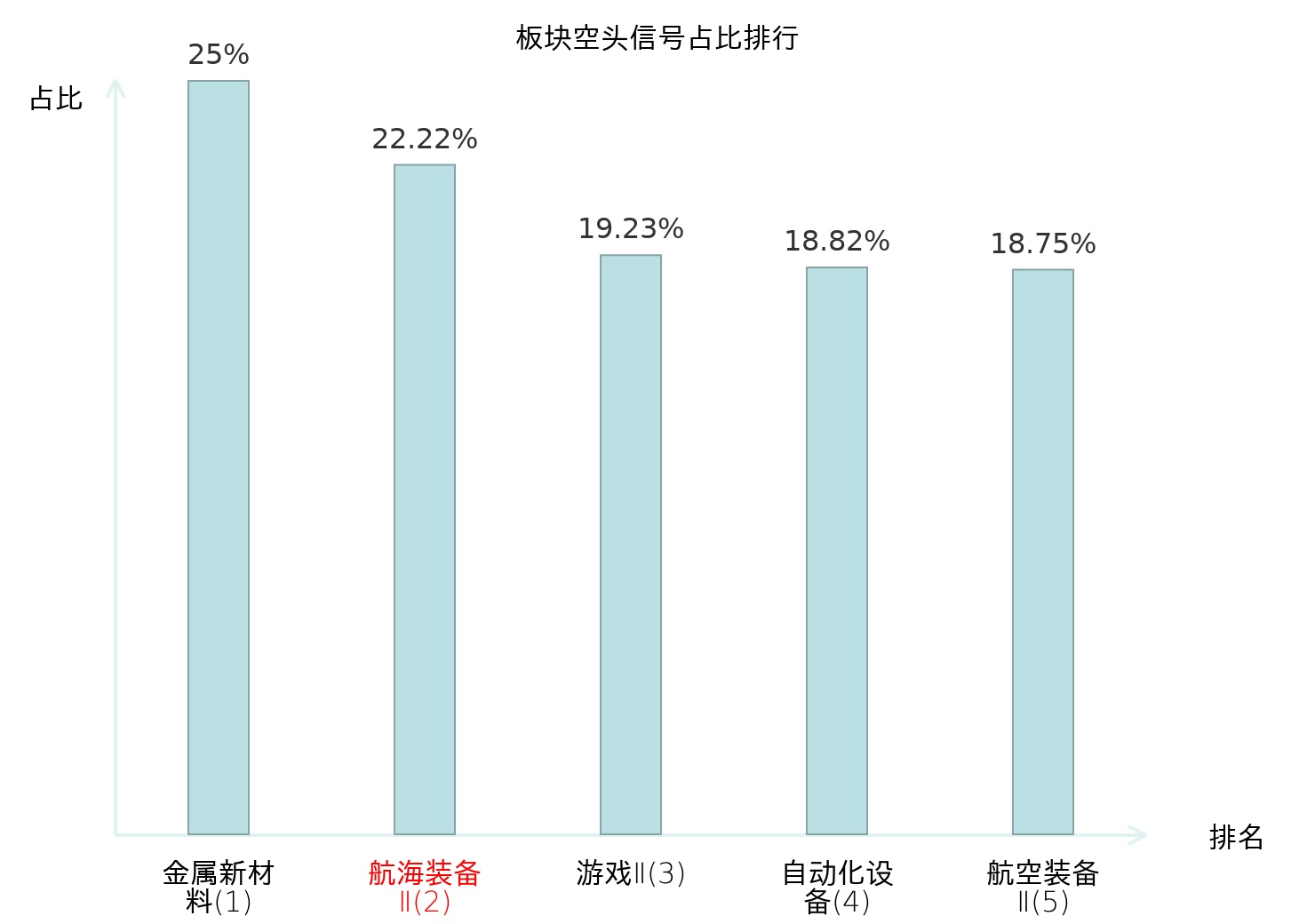 全市场所有行业板块中主力空头信号占比排名中,金属新材料板块位居第一。证券Ⅱ板块名次提升最快,较昨日上升120位。