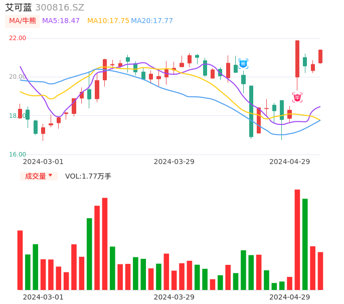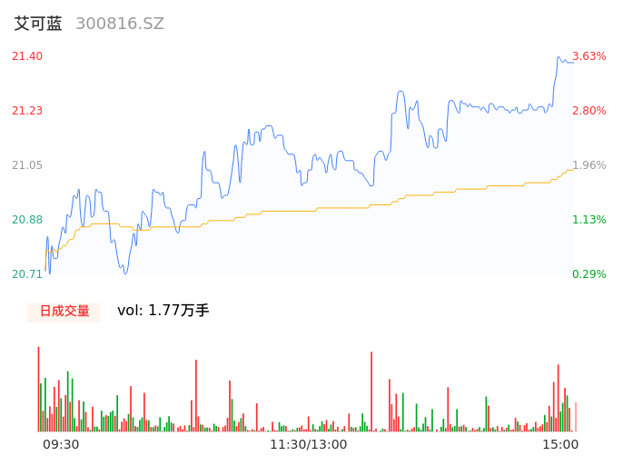 04月29日,艾可蓝收报21.39,股价涨幅3.58%,成交金额3722.90万元,换手率3.66%。