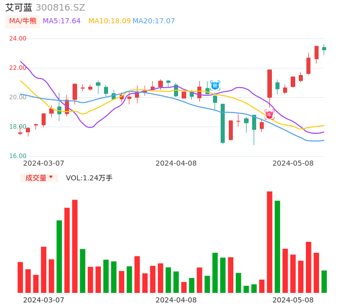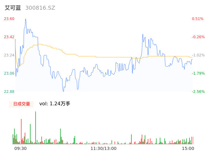 05月08日,艾可蓝收报23.22,股价涨幅-1.11%,成交金额2884.66万元,换手率2.57%。