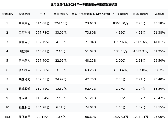 双飞集团最新报告期数据为一季度,下表汇总了通用设备行业内市值靠前的公司一季度主要经营数据