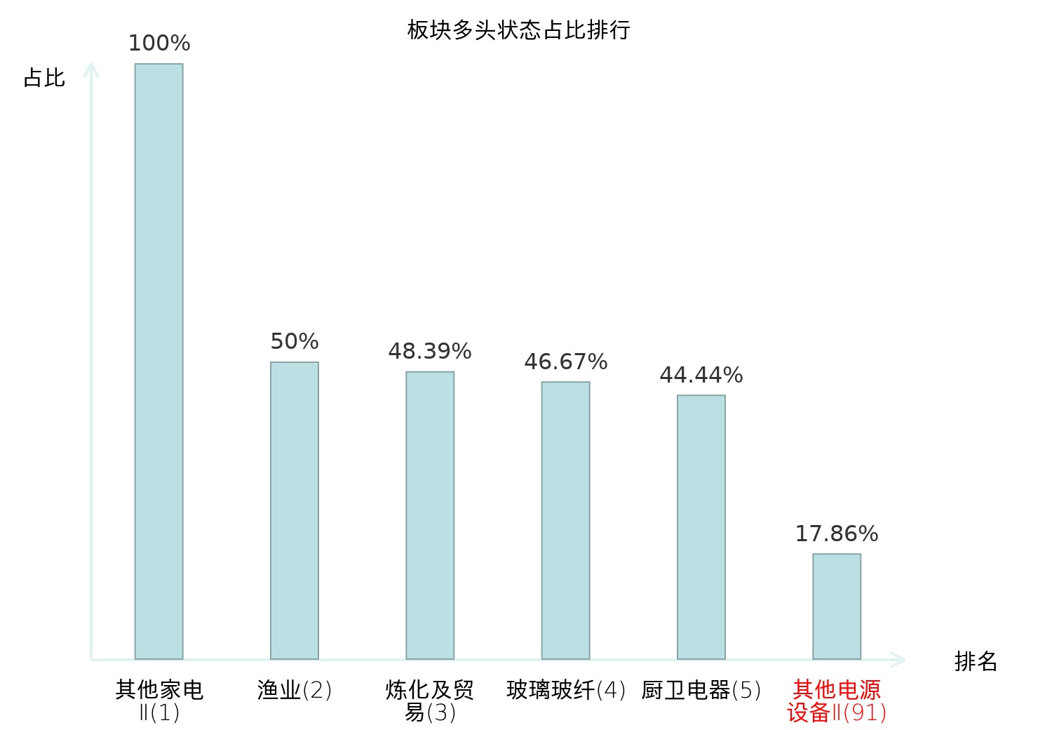 全市场所有行业板块中主力多头状态占比排名中,其他家电Ⅱ板块位居第一。冶钢原料板块名次提升最快,较昨日上升67位。