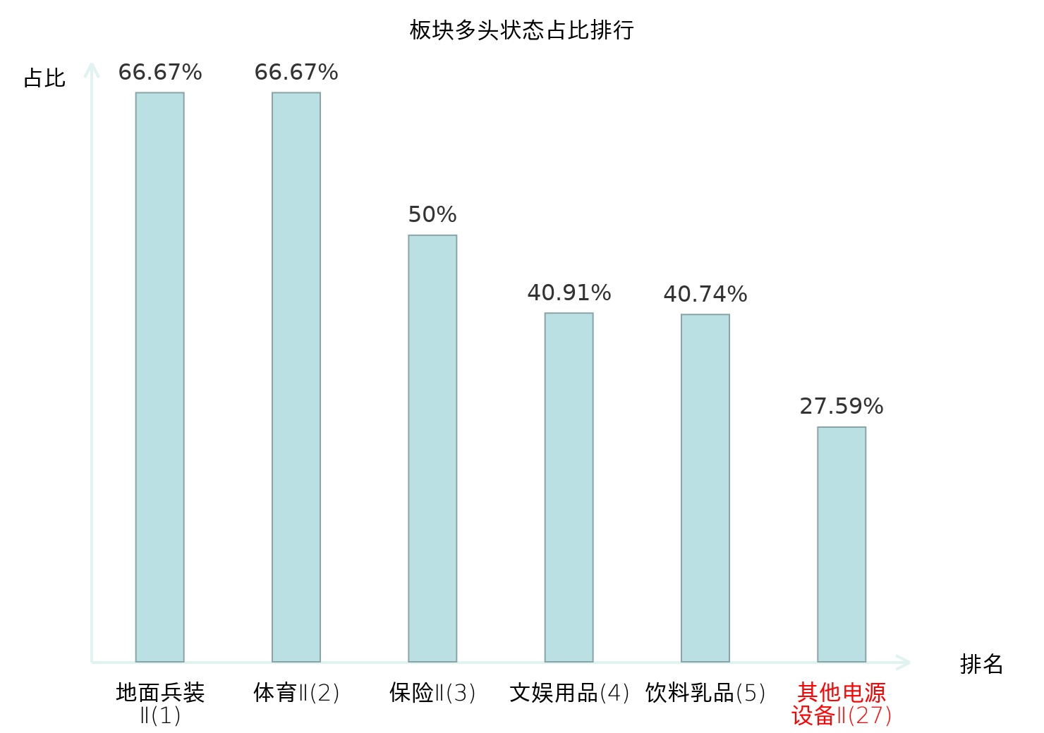 全市场所有行业板块中主力多头状态占比排名中,地面兵装Ⅱ板块位居第一。电视广播Ⅱ板块名次提升最快,较昨日上升82位。