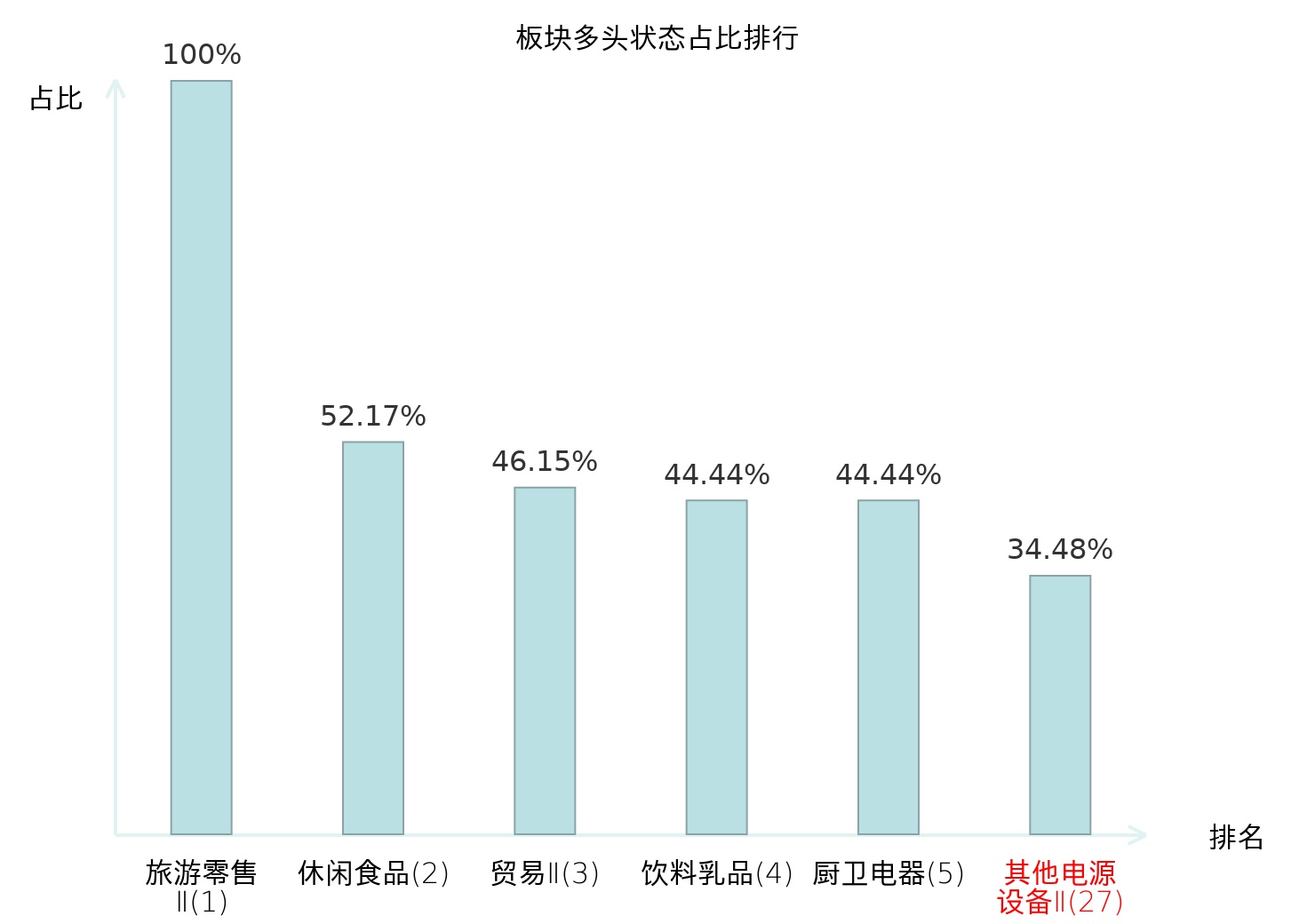 全市场所有行业板块中主力多头状态占比排名中,旅游零售Ⅱ板块位居第一。乘用车板块名次提升最快,较昨日上升91位。