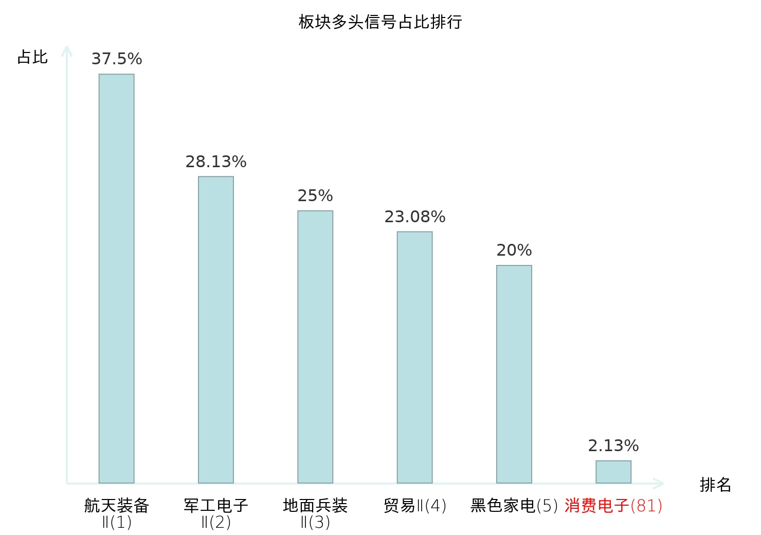 全市场所有行业板块中主力多头信号占比排名中,航天装备Ⅱ板块位居第一。航天装备Ⅱ板块名次提升最快,较昨日上升120位。