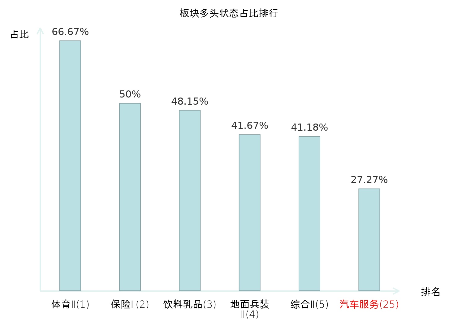 全市场所有行业板块中主力多头状态占比排名中,体育Ⅱ板块位居第一。种植业板块名次提升最快,较昨日上升70位。