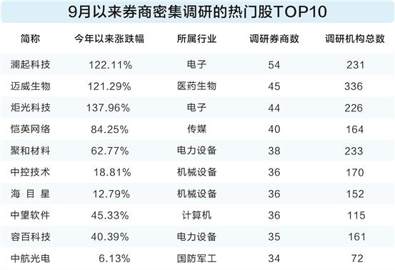 电子行业人气仍然不俗,券商9月以来合计调研了109家相关公司。其中,澜起科技、炬光科技分别吸引了54家、44家券商调研,二者今年以来股价涨幅均在120%以上。此外,TCL科技、领益智造也分别接受30家、28家券商调研。