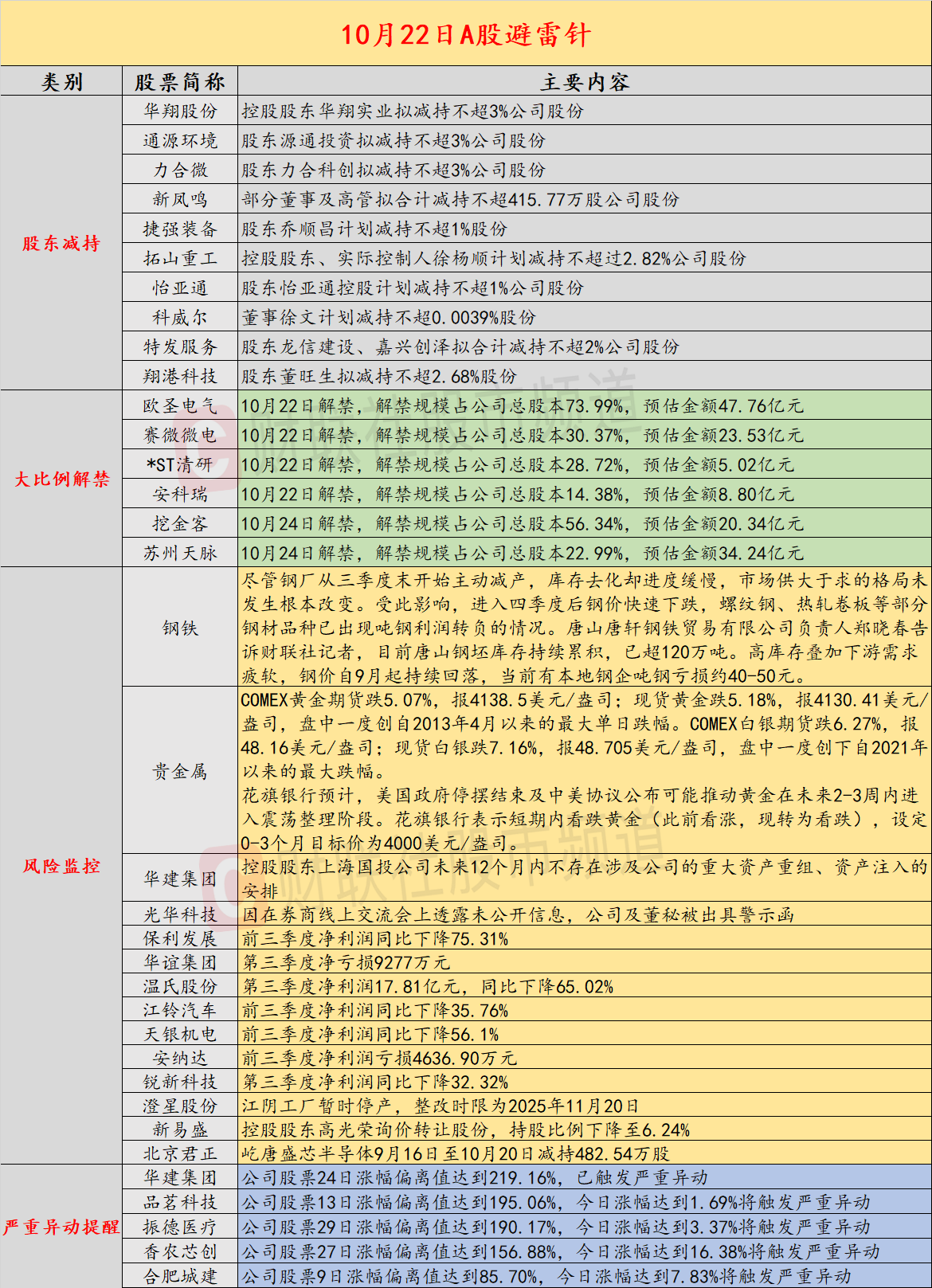 导读:财联社10月22日投资避雷针,近日,A股及海外市场潜在风险事件如下。国内经济信息方面包括:1)进入四季度后钢价快速下跌,部分钢材品种吨钢利润转负;2)消费电子需求疲弱,消费规格MLCC订单前景恐难逆势反弹;公司方面重点关注包括:1)华建集团公告控股股东上海国投公司未来12个月内不存在涉及公司的重大资产重组、资产注入的安排;2)光华科技因在券商线上交流会上透露未公开信息,公司及董秘被出具警示函;海外市场重点关注包括:1)美股三大指数收盘涨跌不一,纳斯达克中国金龙指数收跌0.97%;2)国际金银大幅收跌,黄金盘中一度创自2013年4月以来的最大单日跌幅。