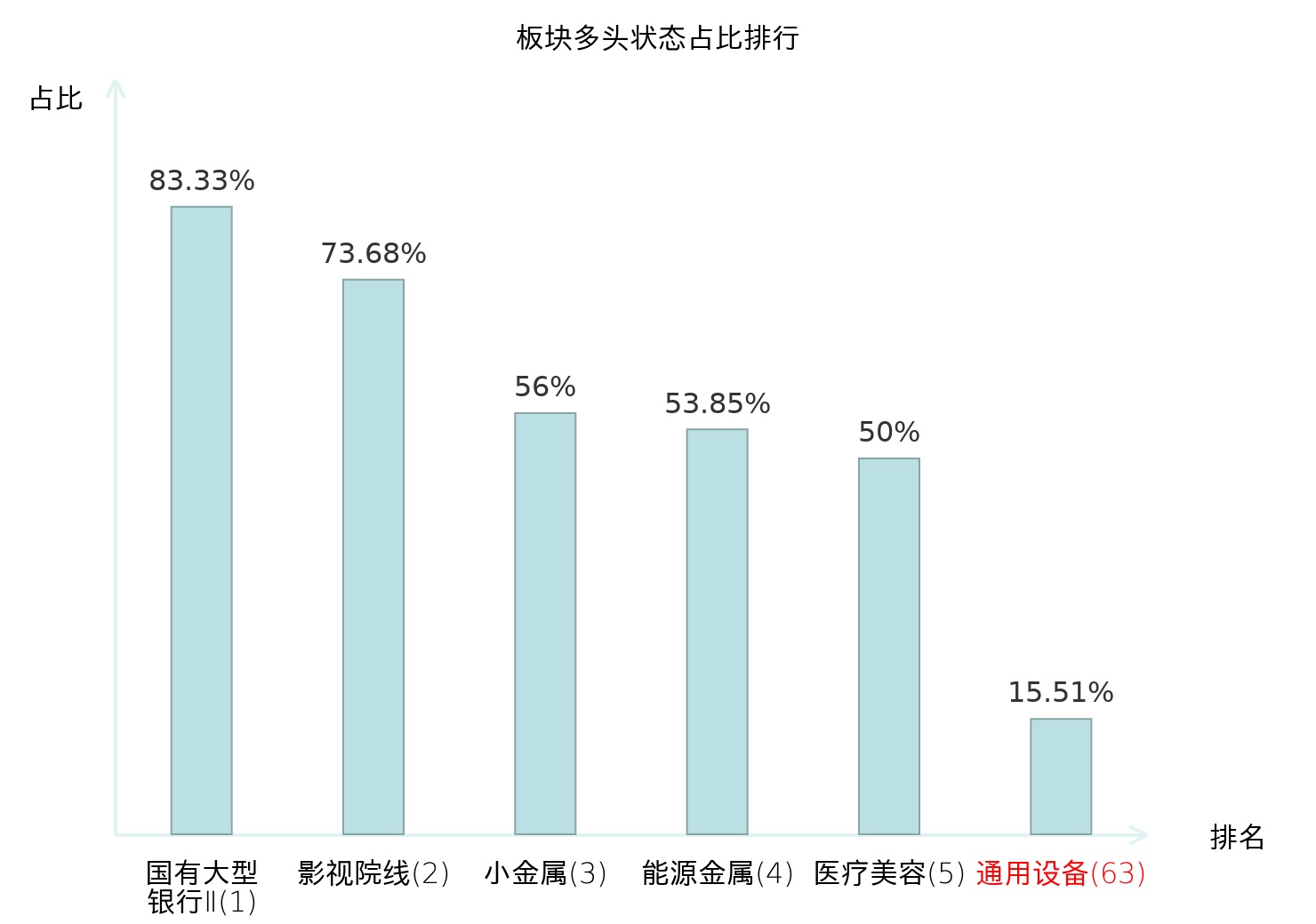全市场所有行业板块中主力多头状态占比排名中,国有大型银行Ⅱ板块位居第一。电视广播Ⅱ板块名次提升最快,较昨日上升99位。