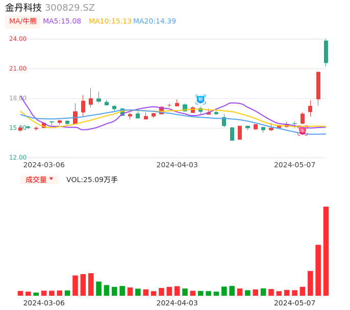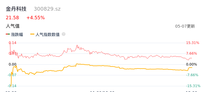 05月07日,金丹科技收报21.58,股价涨幅4.55%,成交金额5.60亿元,换手率20.84%。
