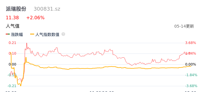 05月14日,派瑞股份收报11.38,股价涨幅2.06%,成交金额1.34亿元,换手率6.46%。