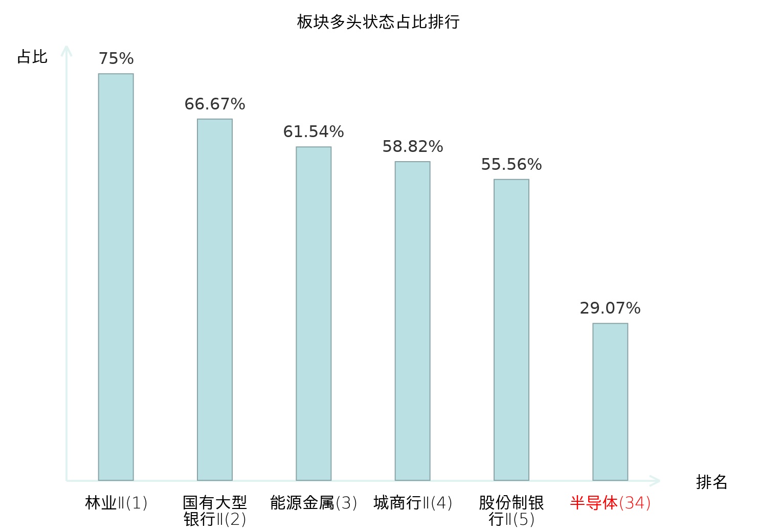 全市场所有行业板块中主力多头状态占比排名中,林业Ⅱ板块位居第一。专业连锁Ⅱ板块名次提升最快,较昨日上升63位。