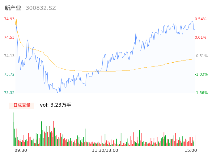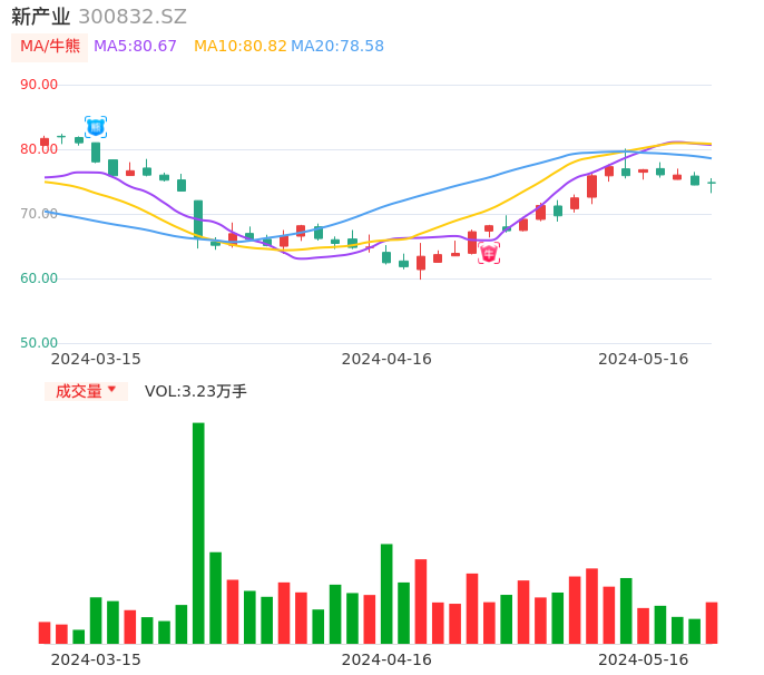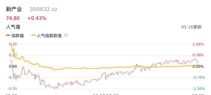 05月16日,新产业收报74.80,股价涨幅0.43%,成交金额2.39亿元,换手率0.46%。