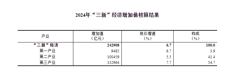 据国家统计局消息,经核算,2024年我国“三新”经济增加值为242908亿元,比上年增长6.7%(按现价计算),比同期国内生产总值(GDP)现价增速高2.5个百分点;占GDP的比重为18.01%,比上年提高0.43个百分点。