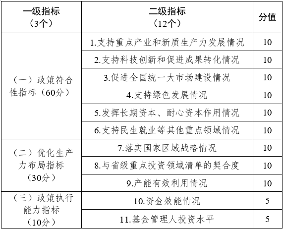 (二)评价指标体系坚持采用定量评价和定性分析相结合,覆盖基金运营全流程。指标体系包括三部分、11个具体指标:一是政策符合性指标(权重60%),重点评价基金投向与国家重大战略、产业发展、宏观政策取向的一致性,包括基金在支持重点产业、支持科技创新和新质生产力发展、推动全国统一大市场建设、服务绿色发展、支持创业投资、保民生稳就业等方面发挥的作用,推动基金立足政策性定位,更好服务国家发展大局;二是优化生产力布局指标(权重30%),主要评价基金支持国家重点区域战略、与省级重点投资领域契合度及有效利用产能情况等;三是政策执行能力指标(权重10%),主要评价基金使用效能情况、基金管理人专业投资、风险防控等方面表现,更好理顺地方政府与基金管理人的关系,推动实现政府引导、市场化运作和专业化管理的有机统一。