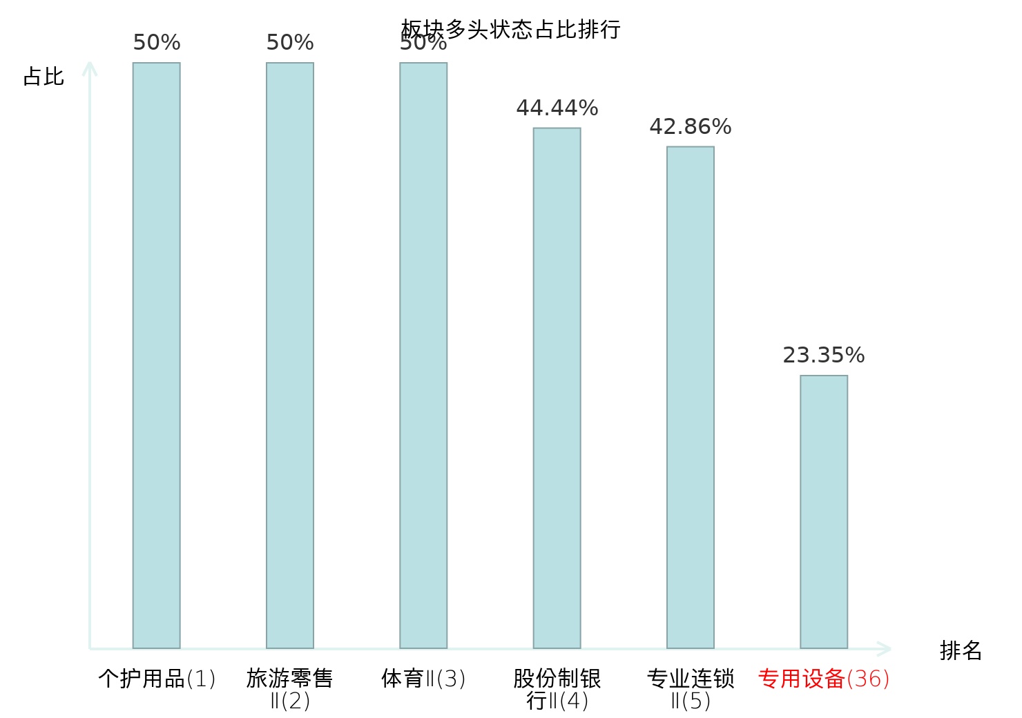 全市场所有行业板块中主力多头状态占比排名中,个护用品板块位居第一。非金属材料Ⅱ板块名次提升最快,较昨日上升37位。