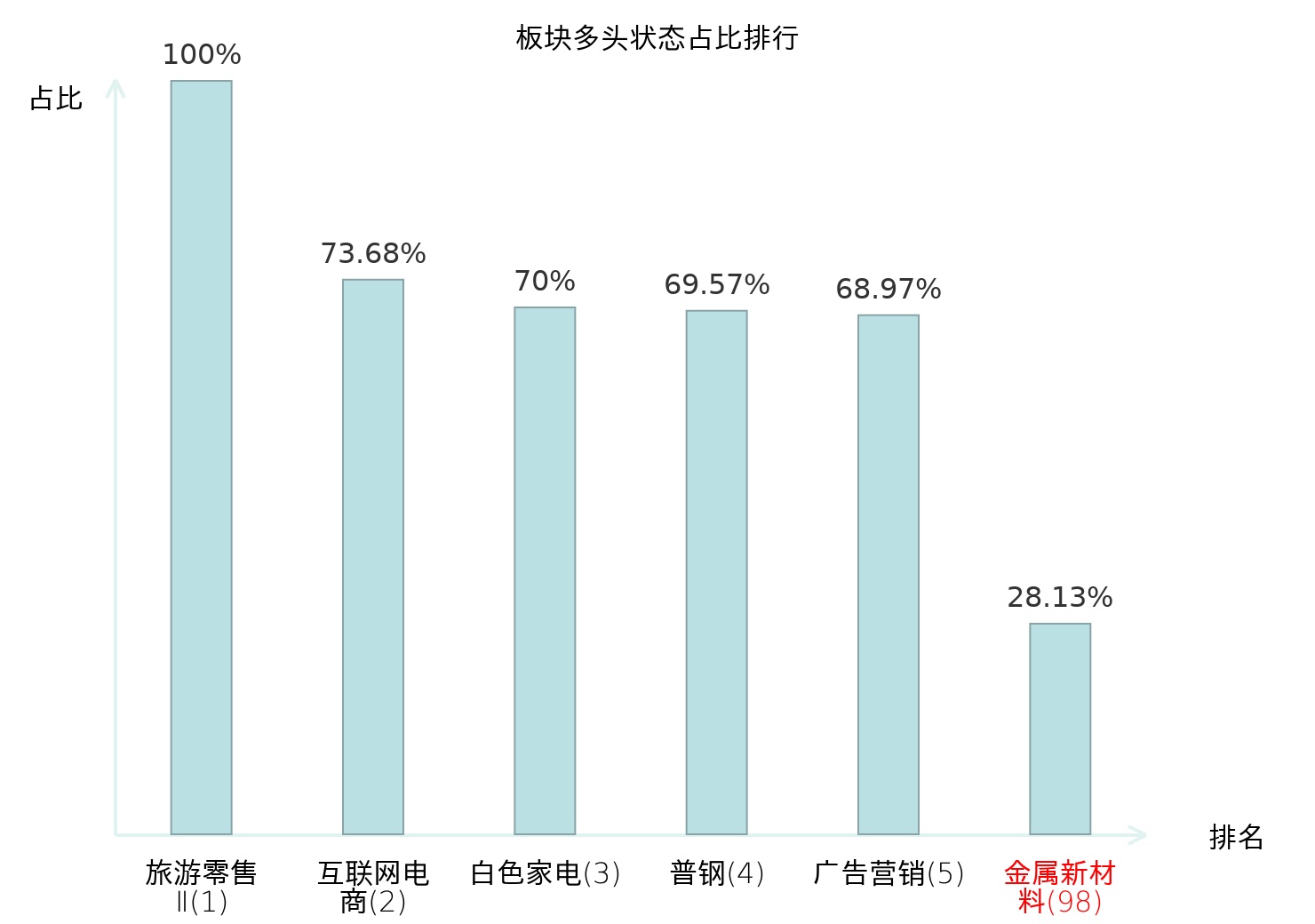 全市场所有行业板块中主力多头状态占比排名中,旅游零售Ⅱ板块位居第一。其他家电Ⅱ板块名次提升最快,较昨日上升66位。