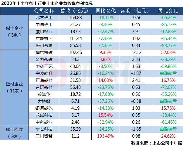 据财联社记者不完全统计,截至8月31日,有18家稀土行业上市公司披露了2023年中报。其中,仅横店东磁(002056.SZ)、正海磁材(300224.SZ)、银河磁体(300127.SZ)、三川智慧(300066.SZ)4家公司净利同比增长,营收和净利均实现增长仅横店东磁、正海磁材和三川智慧3家。