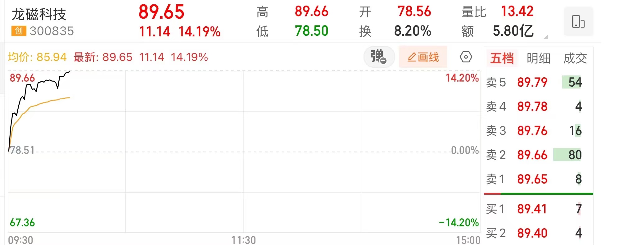 上证报中国证券网讯2月12日上午,龙磁科技盘中一度涨超14%,截至10点,报89.65元。