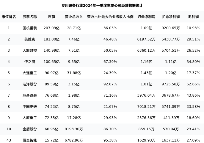 佰奥智能最新报告期数据为一季度,下表汇总了专用设备行业内市值靠前的公司一季度主要经营数据