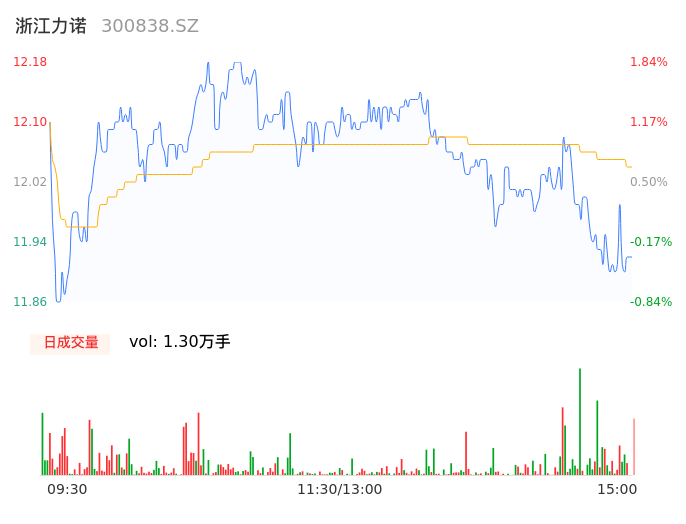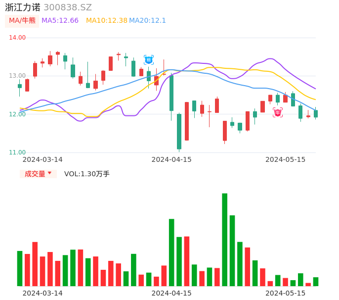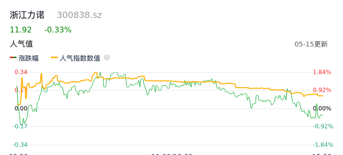 05月15日,浙江力诺收报11.92,股价涨幅-0.33%,成交金额1567.39万元,换手率1.28%。