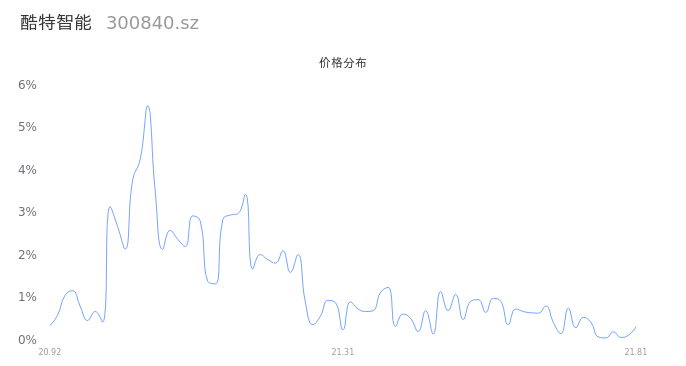 然后我们来看下当日成交的价格分布。将今天股票的最低价与最高价之差形成的价格区间进行切片,并画直方图进行分析,观察成交量在价格区间的分布情况。可以发现,当日的成交分布呈现左偏峰分布,这说明,该股票大部分成交集中在中位数以下,说明交易重心下降,近期可能会存在短线下跌风险。