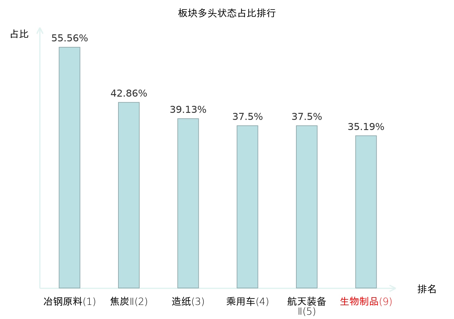全市场所有行业板块中主力多头状态占比排名中,冶钢原料板块位居第一。房屋建设Ⅱ板块名次提升最快,较昨日上升84位。